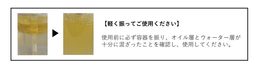 このミストはオイル層とウォーター層が分離した二層式。振らずに使うと成分が均一にならず、せっかくの美容成分を十分に活かせません。使用前は必ずよく振って、2つの層が混ざり合ったことを確認してからスプレーしましょう。この「振る」ひと手間が、贅沢な二層式ミストならではのこだわりです。